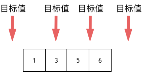 - 情况三:target 在数组范围中,且数组中存在target,例如数组{3,6,7},target为6,此时应该返回{1, 1}